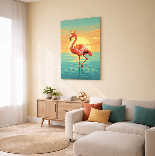 View full detailsThe Crowned Flamingo Sunset Canvas features a majestic flamingo wearing a golden crown, standing gracefully in calm waters against a warm sunset ba...